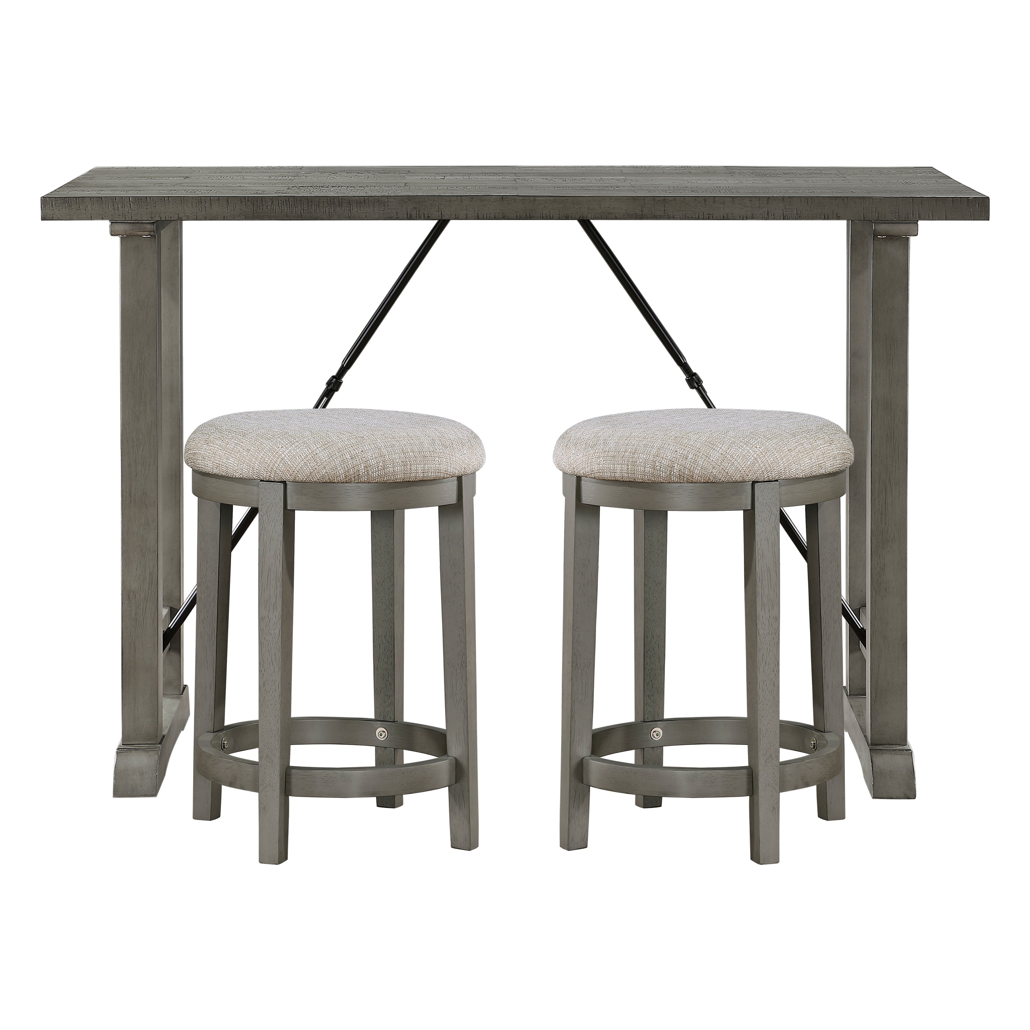 The industrial-inspired design that complements the transitional profile of the Auburndale Collection creates the perfect addition to your home's casual dining space. The structural aesthetic of the black turnbuckle base lends accent to the table's support construction while a light gray finish is utilized to highlight the collection's acacia veneer. The available counter height stools provide functional seating to complement your seating preference, each featuring wood framing and light gray textured fabric upholstered seats.PRODUCT DIMENSIONS: TABLE: 24" x 54" x 36.5"HApron to floor: 35.5"Distance between legs: 42"STOOL: 17" Dia x 24.5"HSeat Width: 17"Seat Depth: 17"Seat Height: 24.5"Listing Includes: 3pc Dining Set (Counter Height Table with 2x Counter Height Stools) Only.Simple Assembly Require.