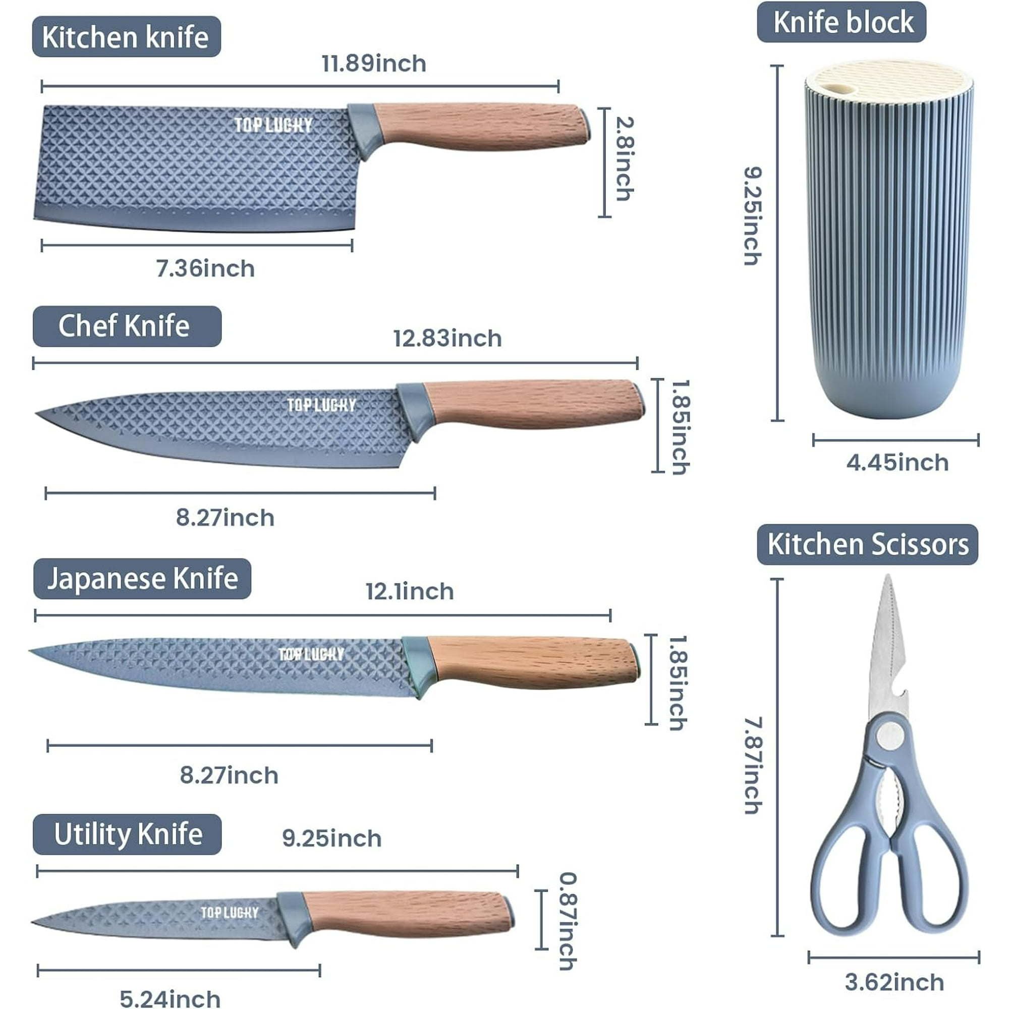 [Practical 6 Piece Knife Set]Including 12" Kitchen Knife, 12.6" Chef's Knife, 12.8" Japanese Knife, 9.3" Utility Knife, 7.9" Kitchen Scissors, 9.3" Universal Knife Block.They can meet all your cutting needs, and the universal knife block can store the entire set of knives, ensuring the cleanliness of your kitchen countertop.