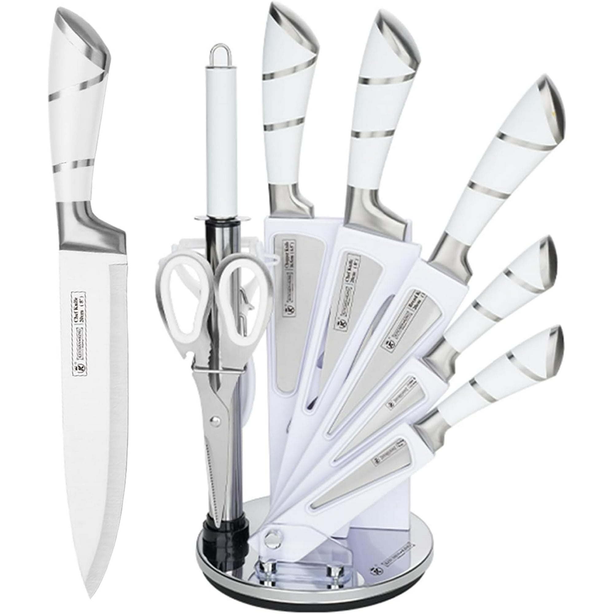 [All-in-One]This white set of knives includes: Chef Knife, Slicing Knife, Bread Knife, Utility Knife, Fruit Knife,Knife Sharpener,Kitchen Scissors,Peeler,Rotary Knife Holder.This 9-piece kitchen knife set is widely used for cutting, slicing, shearing, chopping, and can meet your various cutting needs while cooking.