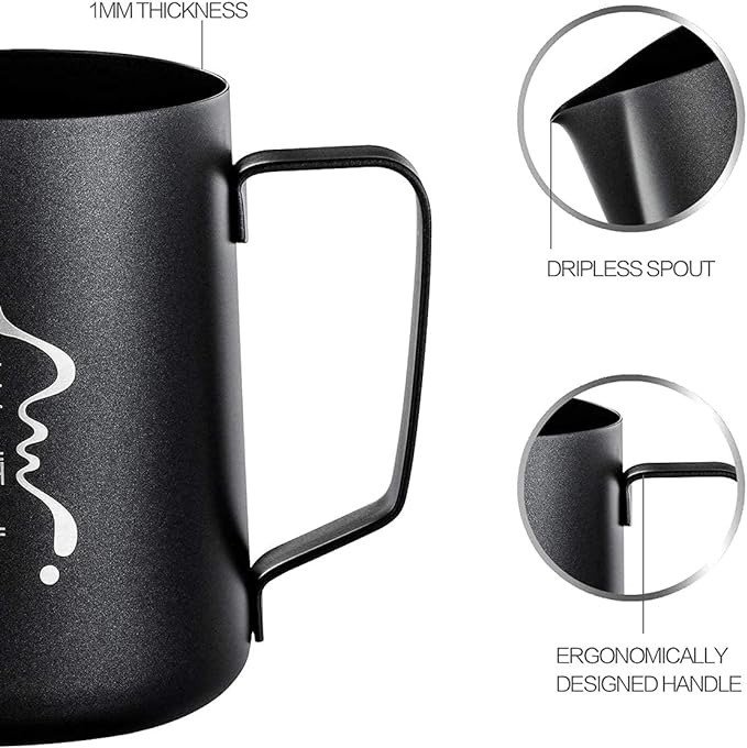 • EASY POURING - The simple design and dripless spout means no mess and perfect latte art.Easy to grip and pour,you won't feel soured hands when doing much latte job.With heat-resistant handle, the frothing pitcher is very safe and comfortable for every use,worry-free!