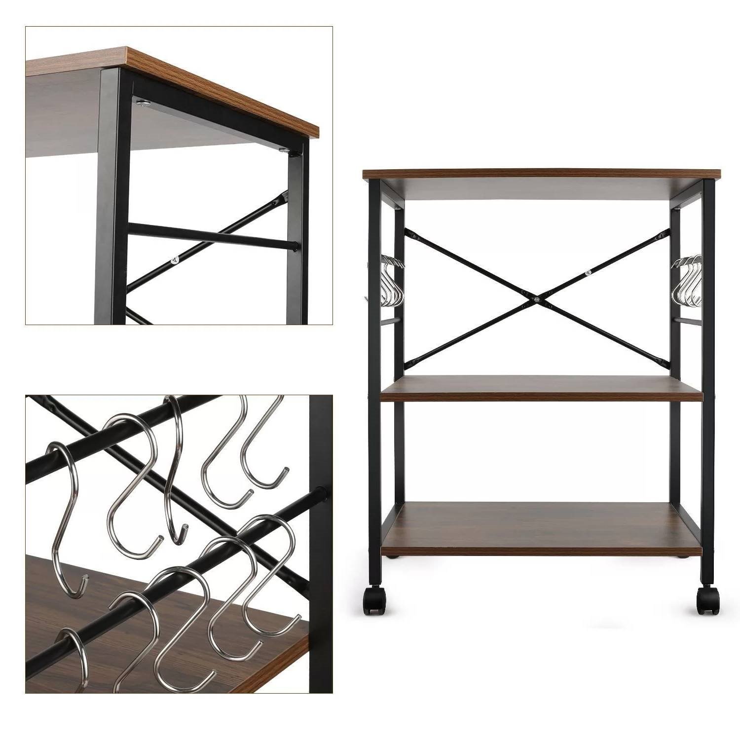 Everything you need to create your dream kitchen is possible. This Industrial 3-Shelf Metal Wood Rustic Brown Baker's Rack Kitchen Microwave Cart is made of particleboard which makes it more durable. Exquisitely carved designs decorate your kitchen. This shelf can help you to store bowls, wine, and spices and provide you with a clean tidy kitchen. Beautiful things bring you a good mood. What are you waiting for? It will not let you down.