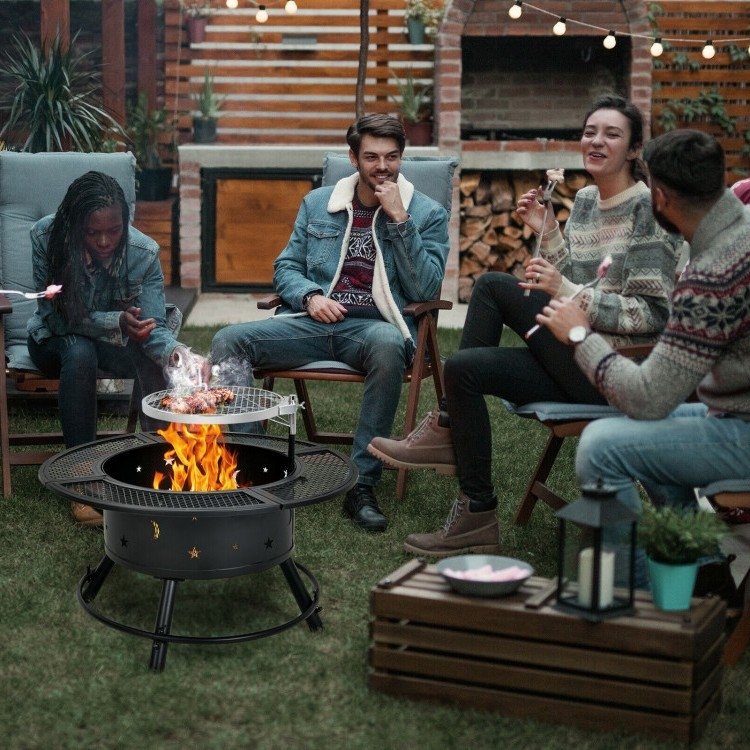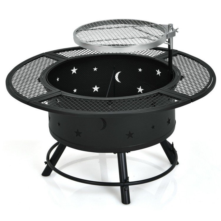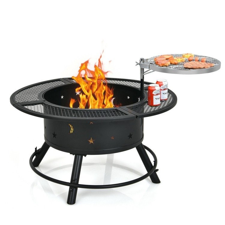 This Camping Outdoor Wood Burning Fire Pit with Swivel BBQ Grill Grate has a unique 2-in-1 design to make camping or backyard parties more practical and convenient. High quality material with stable construction ensures long time service, and you can use it outdoors without worry. Besides, the folding log rack and cutout mesh design offers good ventilation. Comes with 360° rotating grill plate can be adjusted up and down according to your needs. Handy fire poker is helpful for you to control the fire and wood. This multifunctional fire pit not only brings warmth to you, but also adds unique beauty to the backyard, patio, deck, or poolside.