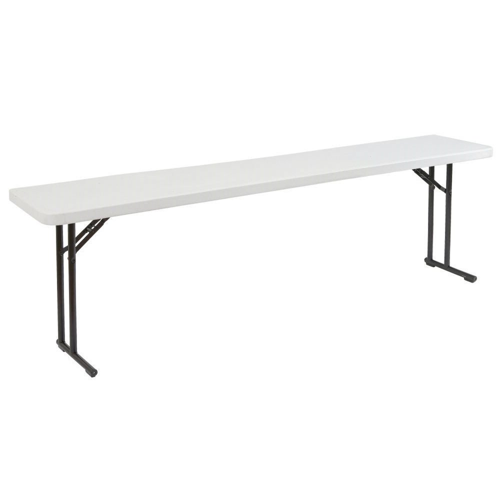• 72" long rectangular plastic folding table with steel frame for temporary placement and compact storage when not in use