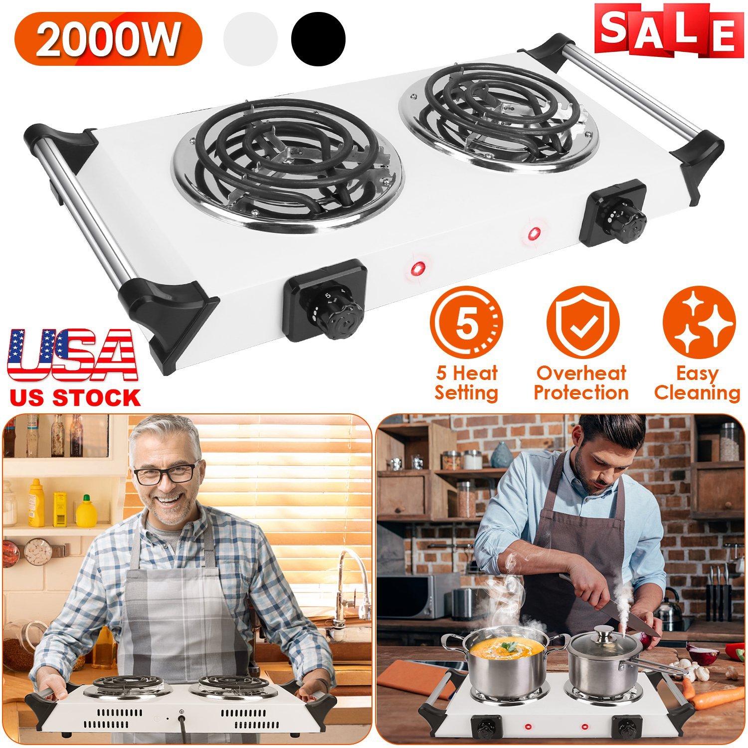 Home > 2000W Electric Dual Burner Portable Coil Heating Hot Plate Stove Countertop RV Hotplate with 5 Temperature Adjustments Portable Handles
