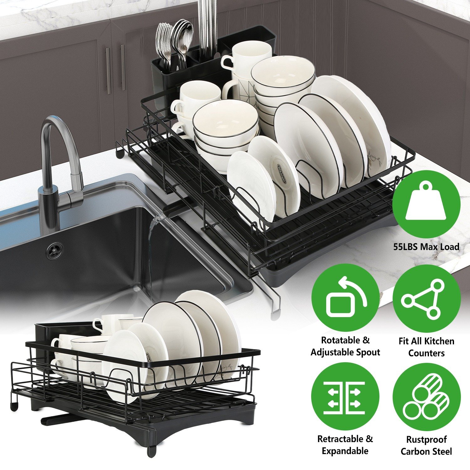Home > Retractable Dish Drying Rack Extra Large Dish Rack with Drainboard Utensil Holder for Countertop Over Sink Rustproof Expandable