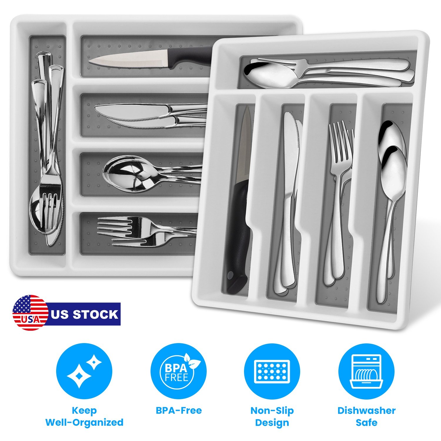 Home > 2Pcs Silverware Organizer Utensil Flatware Organizer Kitchen Drawer Silverware Storage Tray with Non-Slip 5 Compartments For Cutlery Spoon Fork