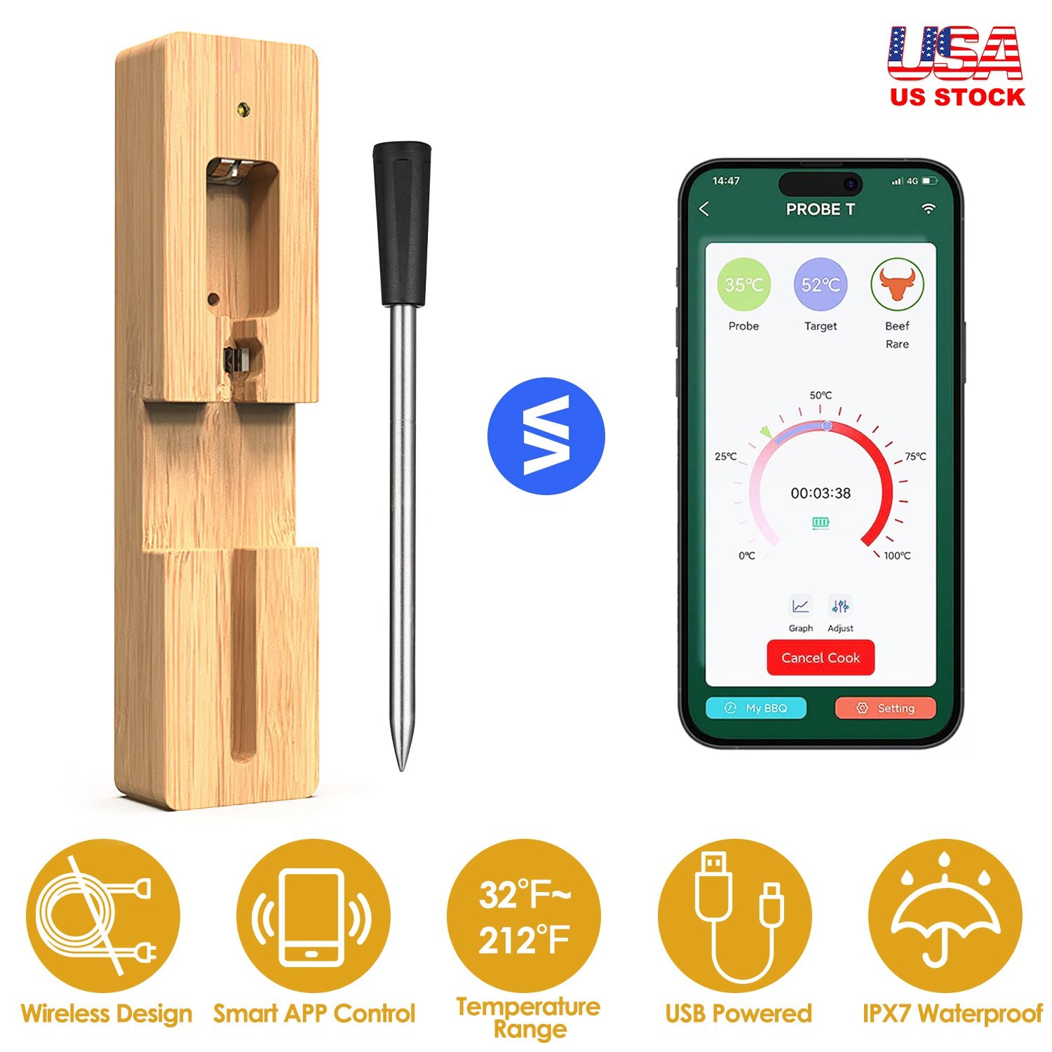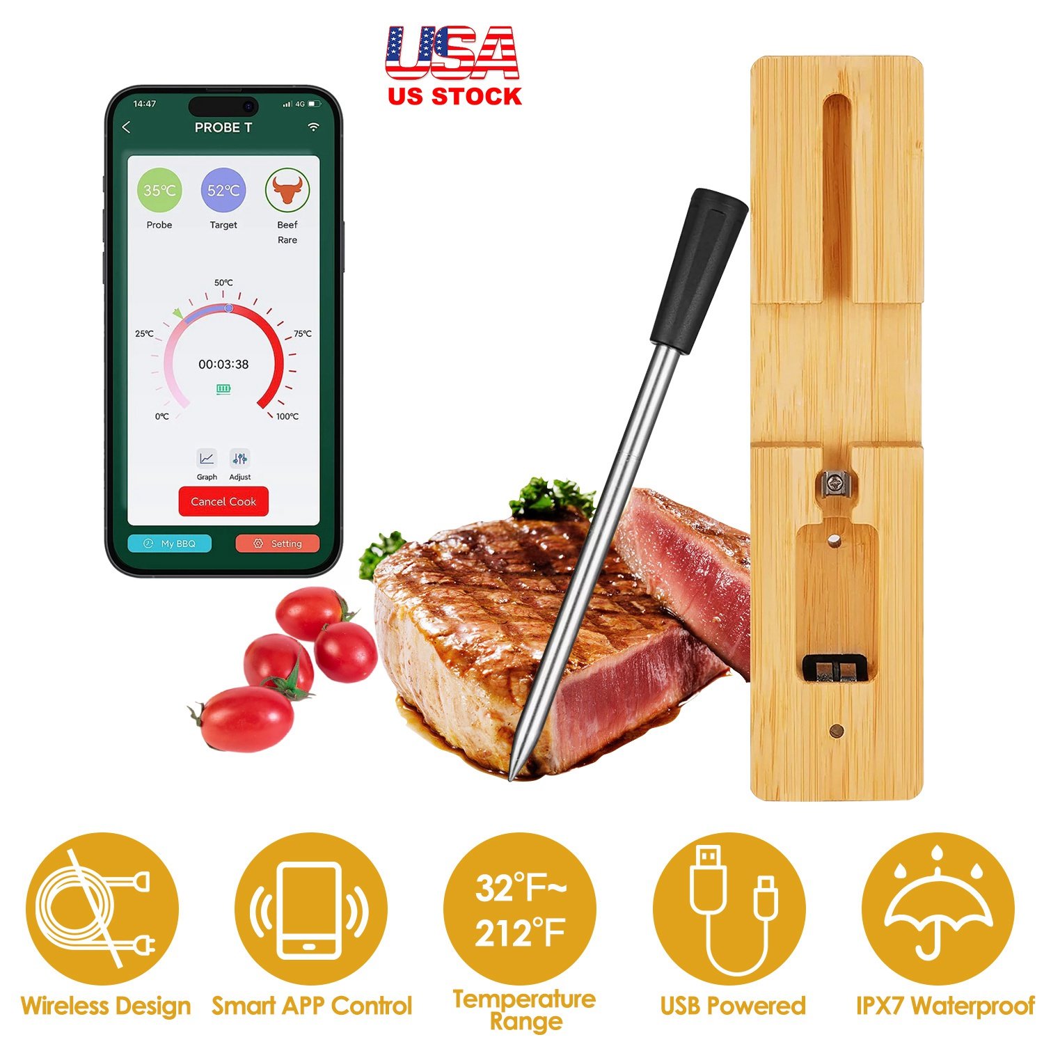Material: 304 Stainless Steel Probe+Bamboo Charging Dock