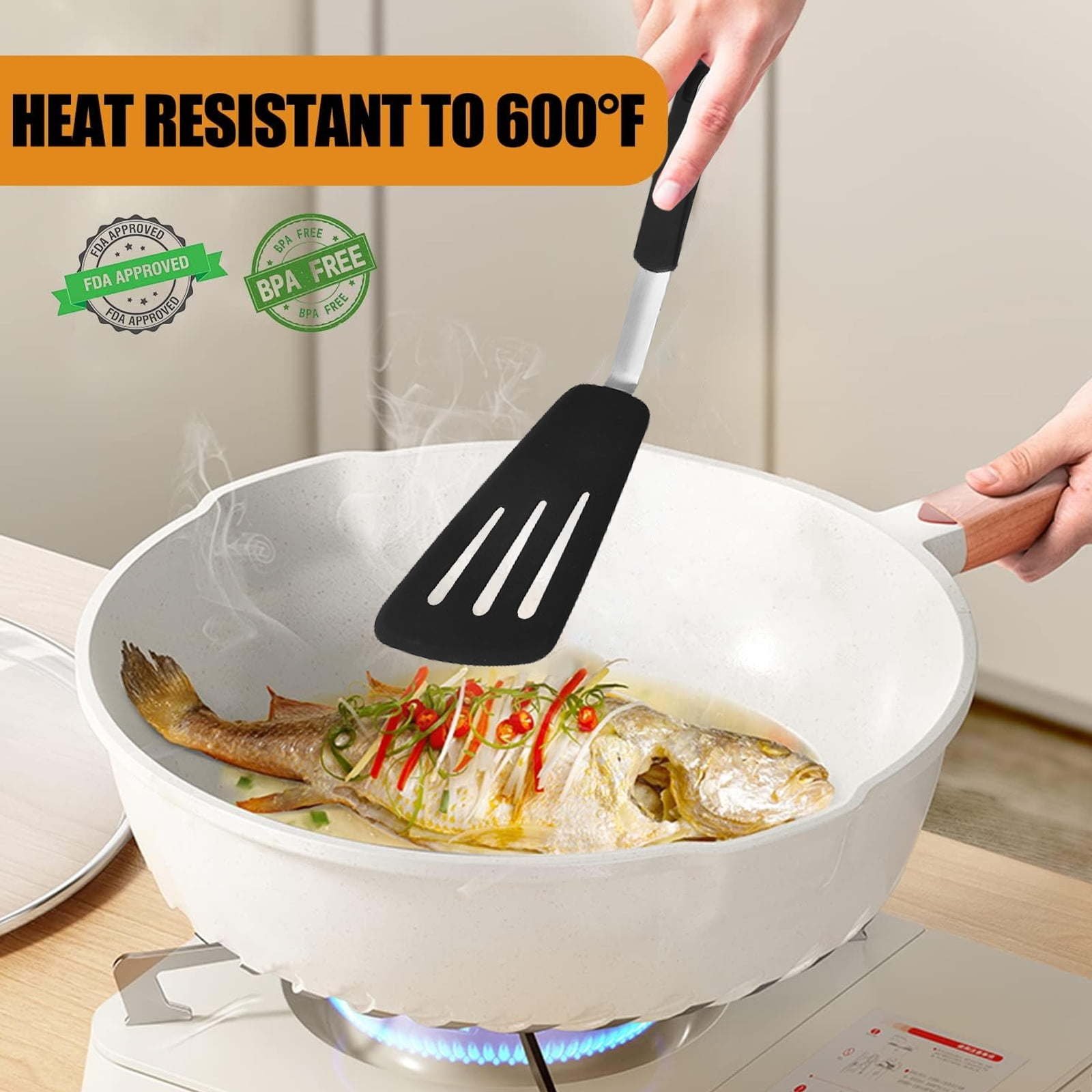 [Flexible Silicone Head & Non-slip Handle]Silicone spatula turner with flexible silicone head, the thin and wide spatula angled edge let you can easily glides beneath food. Ergonomic arc handle both anti-slip and heat resistant design.
