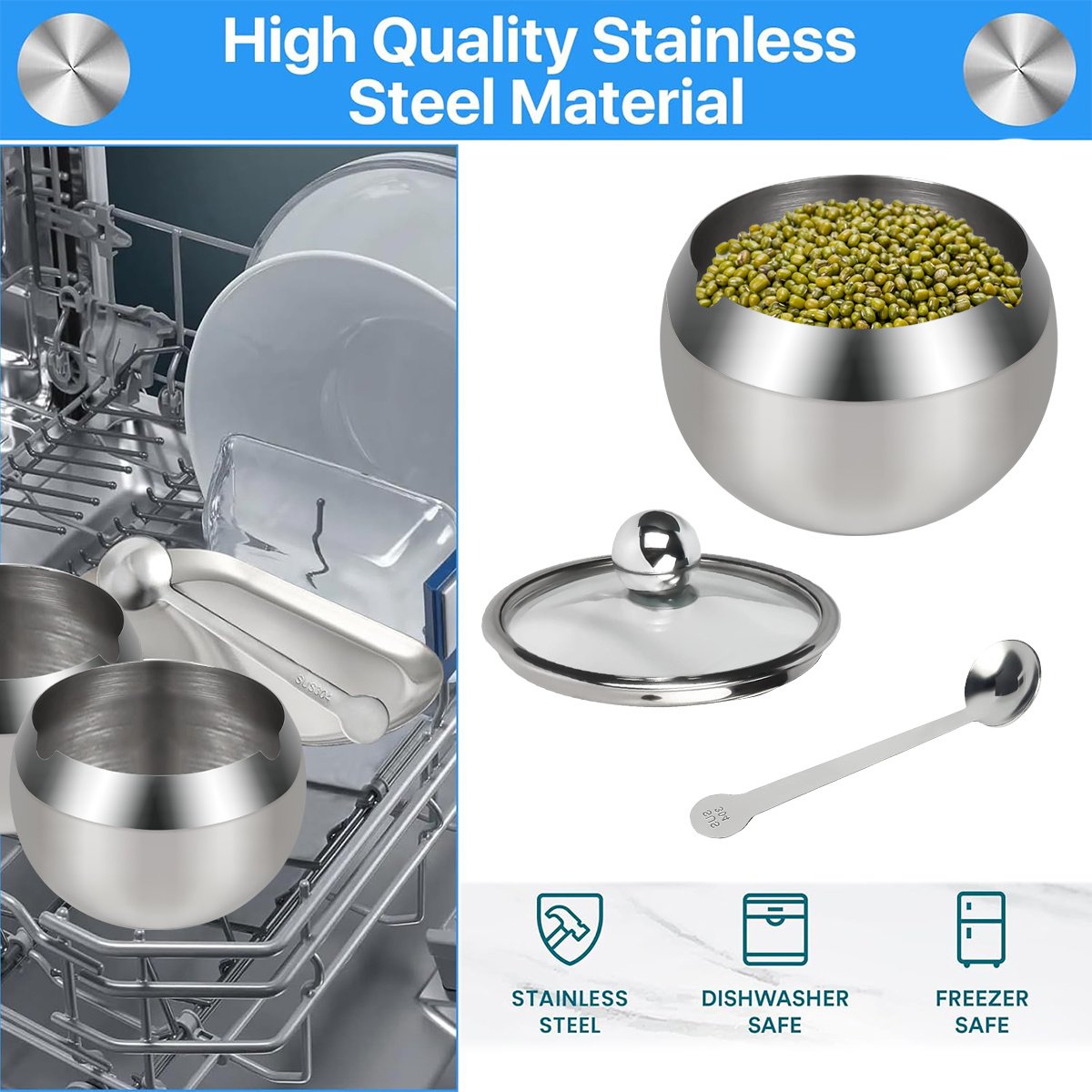 Food Grade Material: Sugar bowl with clear lid and spoon made of 304 stainless steel and clear glass, unbreakable and durable, add a touch of elegance to your table with this stainless steel sugar bowl and matching spoon.