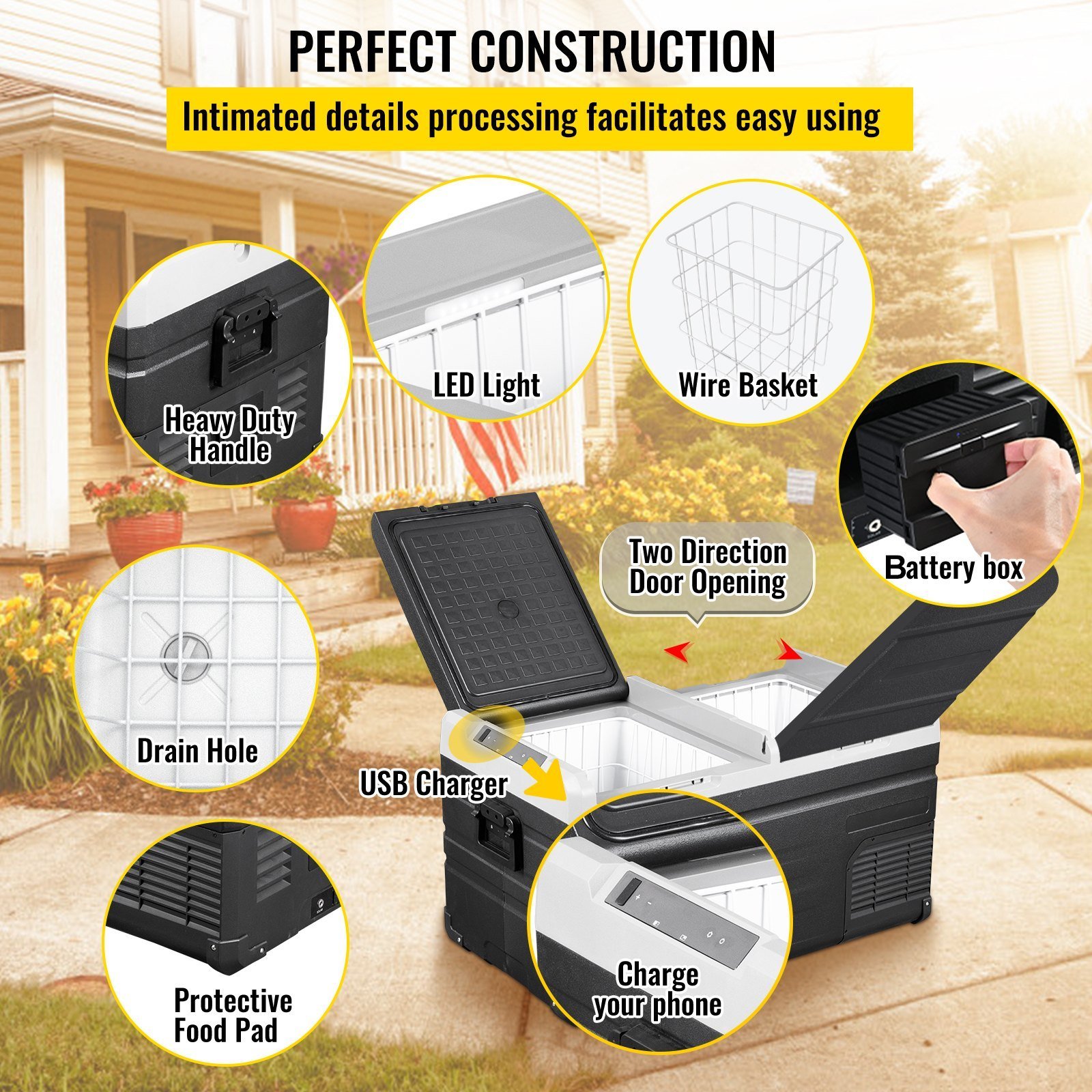 Our car refrigerator has many considerate details. The built-in LED light allows you to see the inside of the refrigerator. The handle improve portability, and the drain hole avoids ponding when in use. The detachable basket makes it easier for you to take things out. The battery box allows you to load the battery yourself. (Our refrigerator does not include batteries)