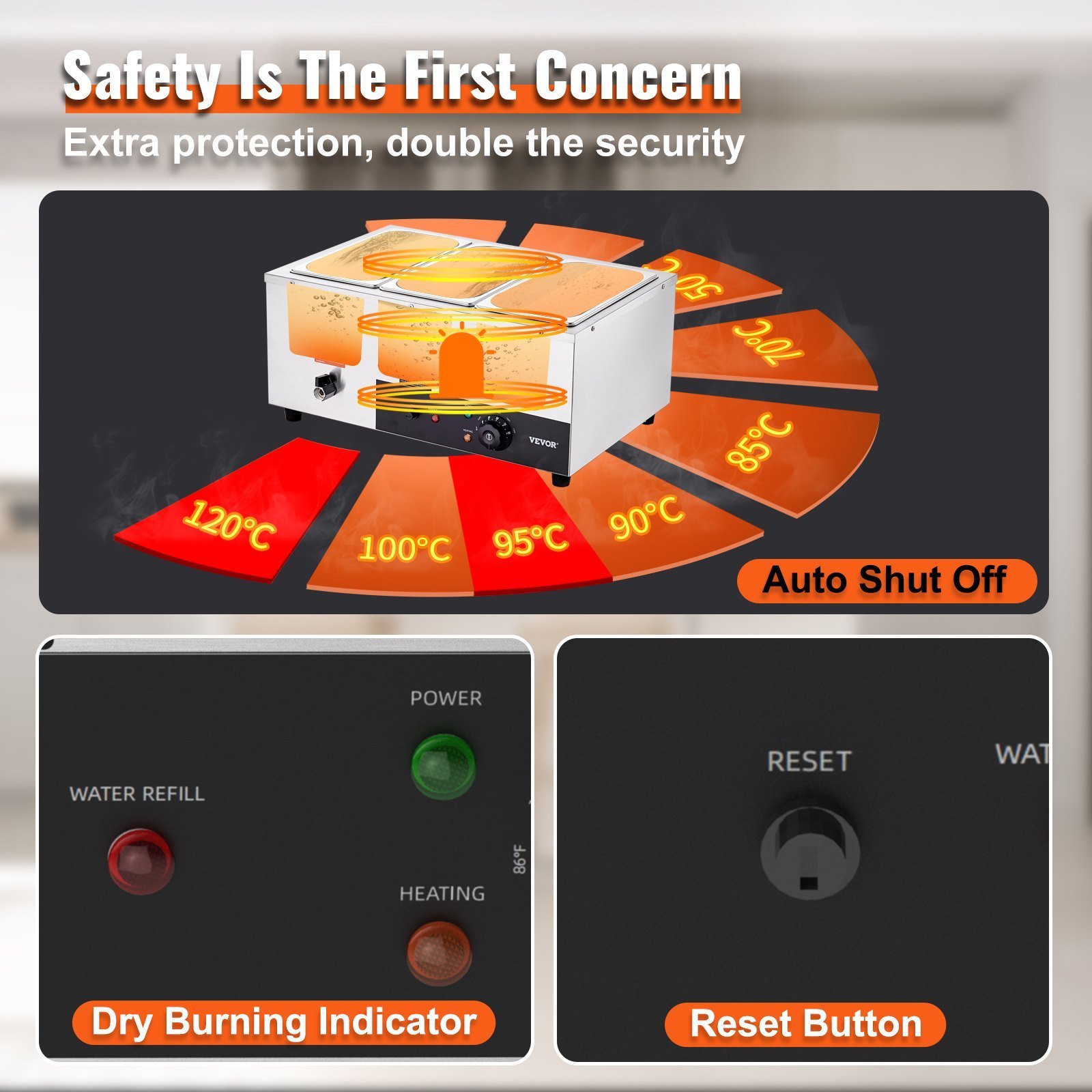 3.Additional Security: We have upgraded our food warmer with newly designed "Dry Burning Indicator" and "Reset Button". The dry-burning indicator function automatically stops heating the food when the temperature exceeds 248°F (120°C). To resume operations, simply refill the water and press the Reset Button.