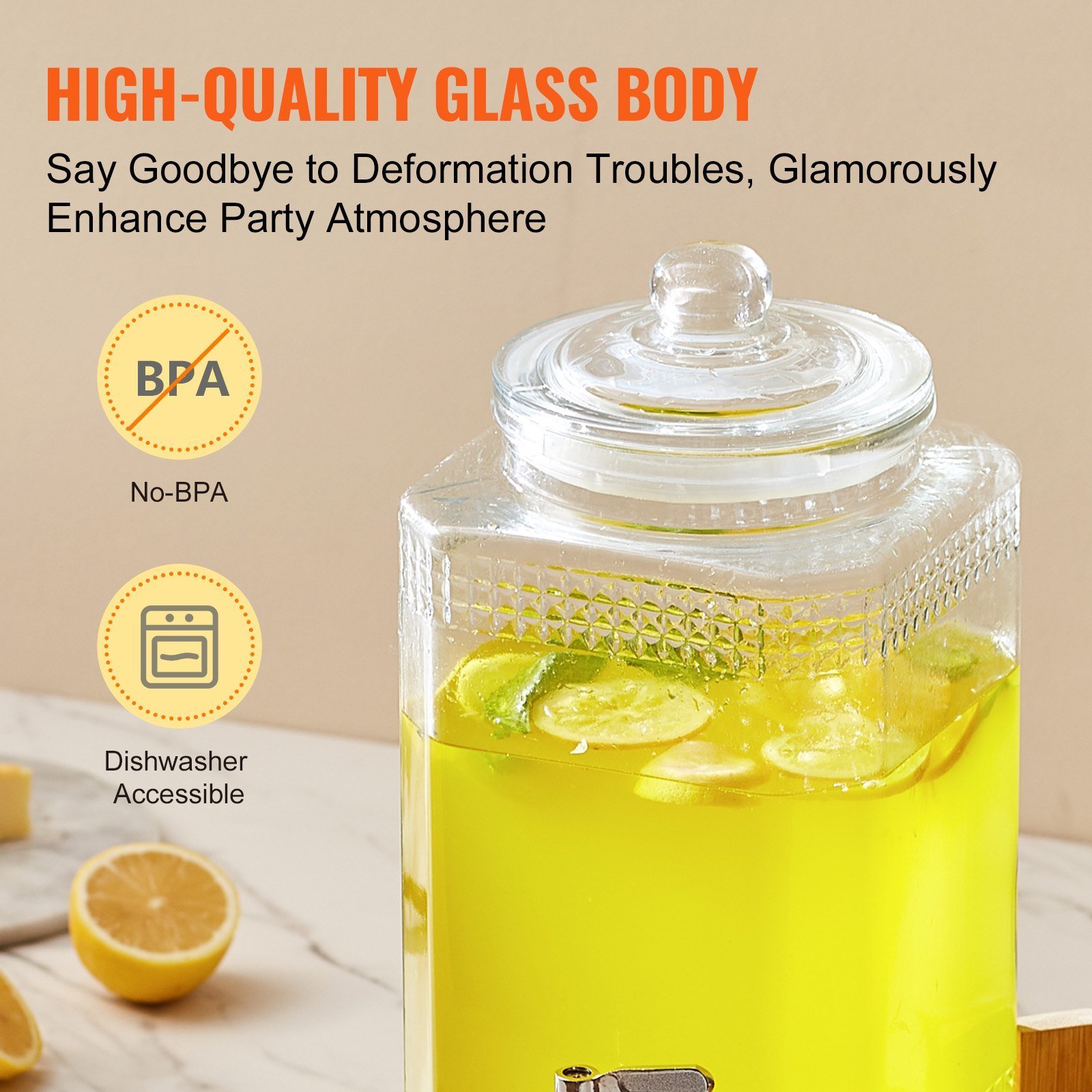 3.Selected Food-grade Glass Material: The beverage dispenser is made of high-quality glass, more durable and stable! Add ice cubes at will, chilled beverages without worrying about deformation or breakage. It's also stain-resistant and durable, no more worries about hard-to-clean containers! Simply soak or put it in the dishwasher to easily clean.