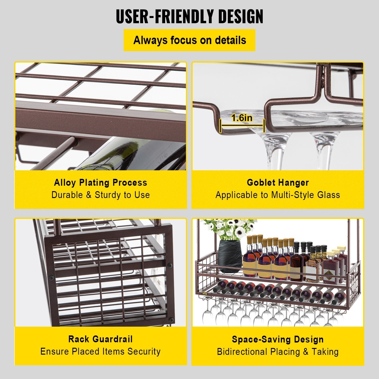 1.Two-in-one Heavy Duty Rack: Our ceiling wine glass rack adopts a multifunctional design. The 46.9 x 11.8 x 9.8 inches shelf can be used to store wine bottles, while the bottom hanger is well-designed for holding a maximum of 33 glasses, satisfying your demands in placing plenty of bottles and glasses up to 33 pounds. Besides, the 2 extra offering hooks are perfect for hanging tools like cleaning cloths or bottle openers.