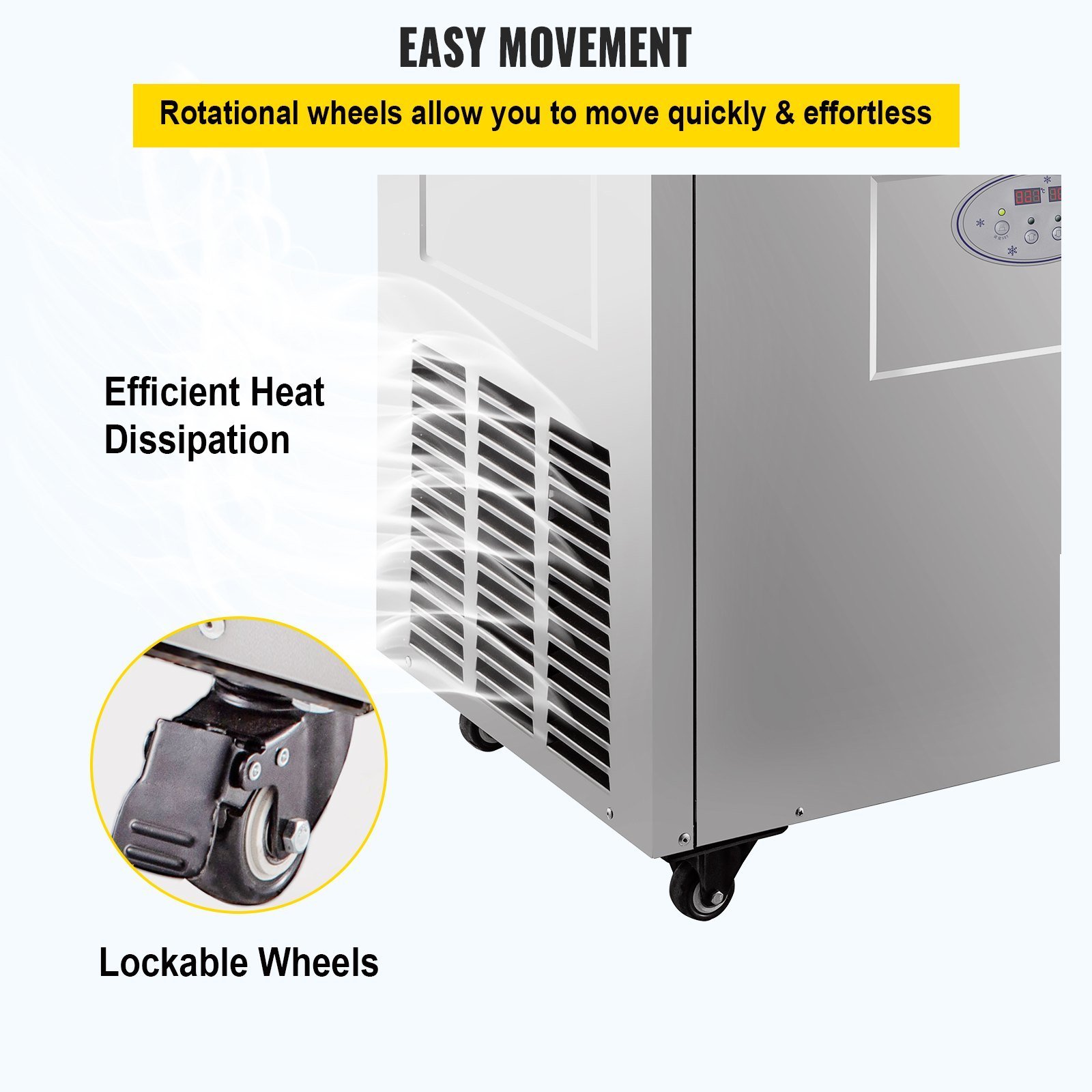 The commercial ice popsicle machine is equipped with four caster wheels for easy transportation, and two of them are designed with brakes for a fixed position. Air vents on both sides ensure maximum airflow for efficient heat dissipation.
