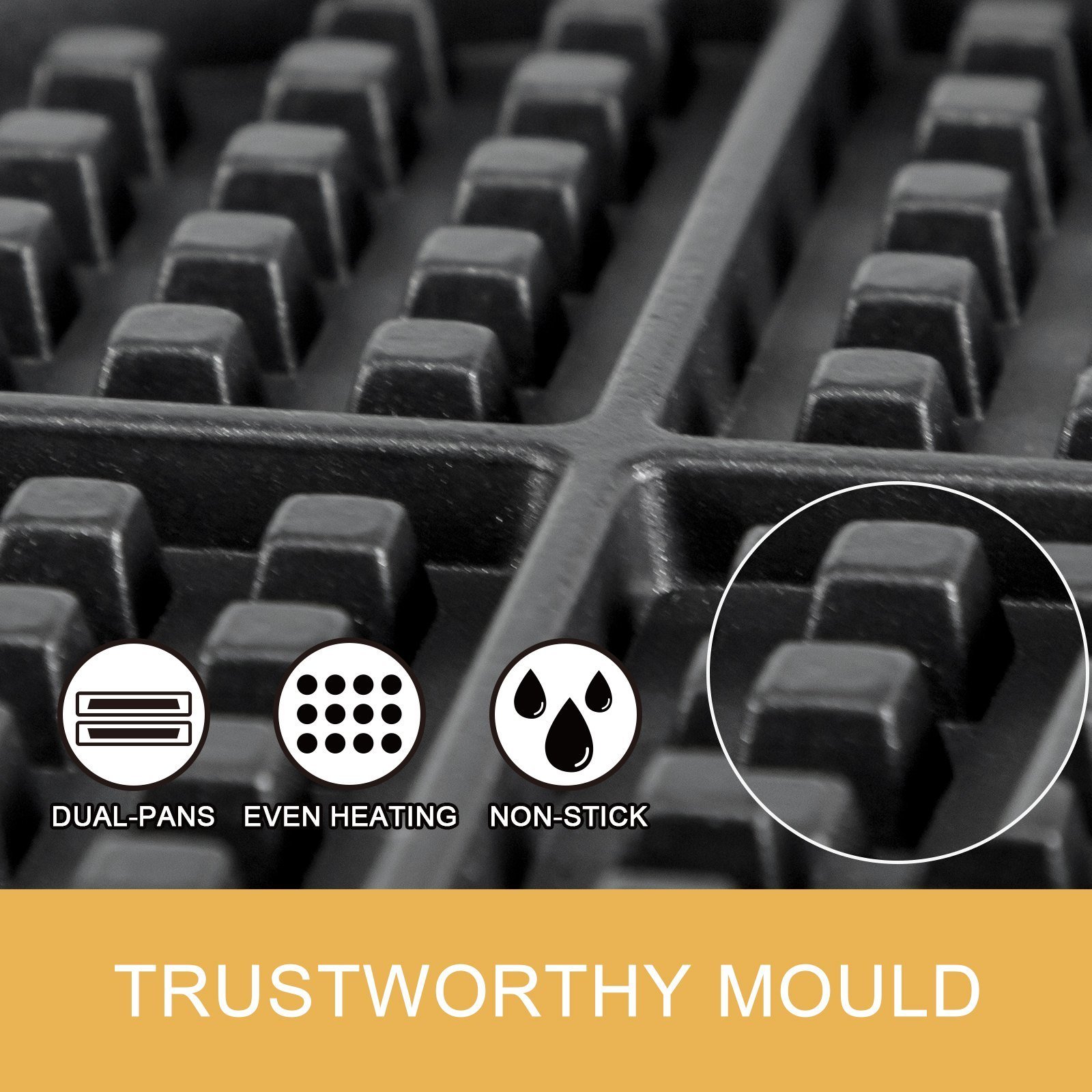 The waffle maker adopts dual pans (upper and lower). The mold with a diameter of 7.1"(180mm), depth of 0.3"(8mm). Both pans provide even heating. Teflon coated surface for non-stick cooking and keeps your place neat.