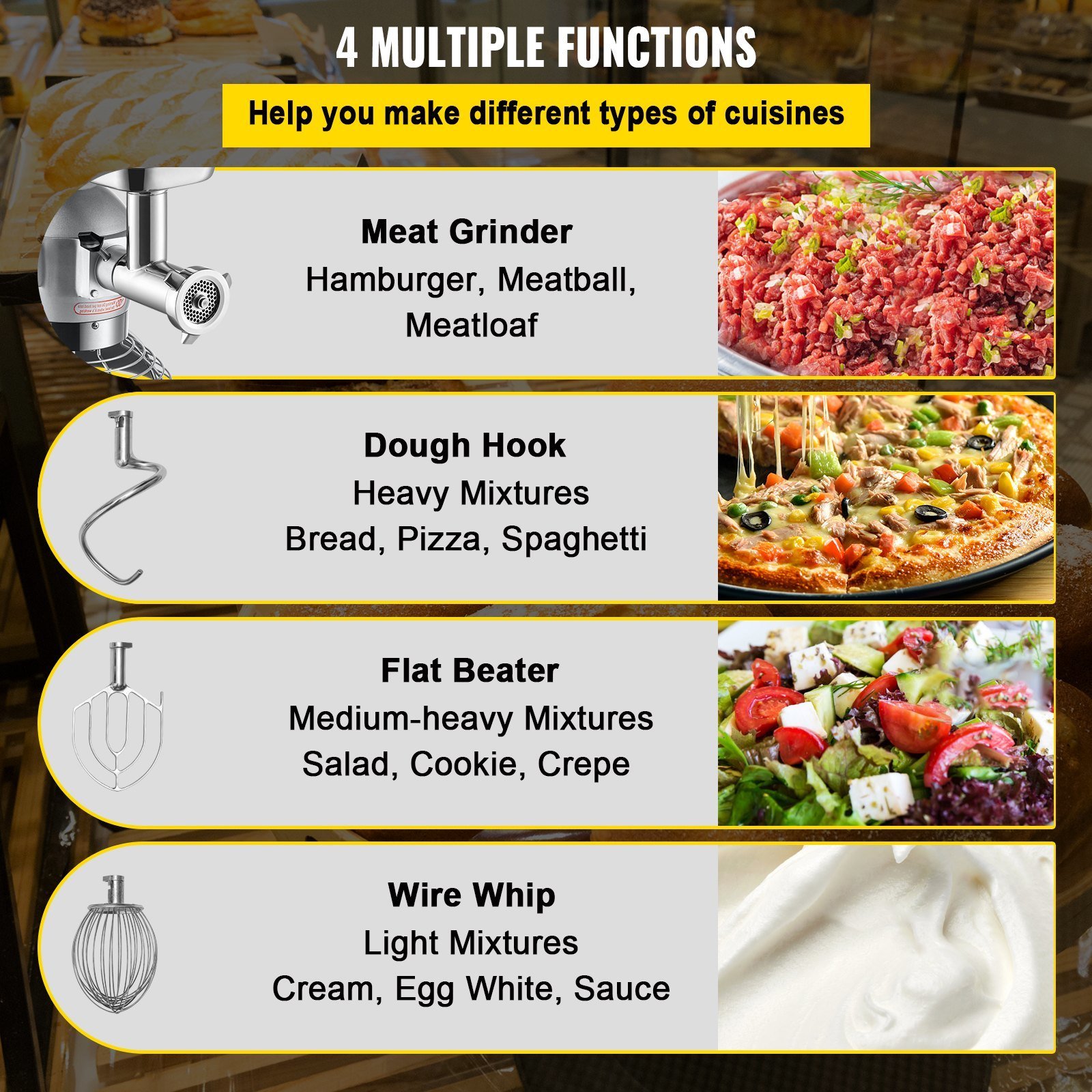 It's widely used in restaurants, hotels, pizzerias, bakeries, commercial kitchens, etc. Perfect for meat grinding and all your food mixing needs, including creaming, mixing, beating, whipping, and kneading. Incredibly suitable for making pizza dough, bread dough, cake batter, etc.