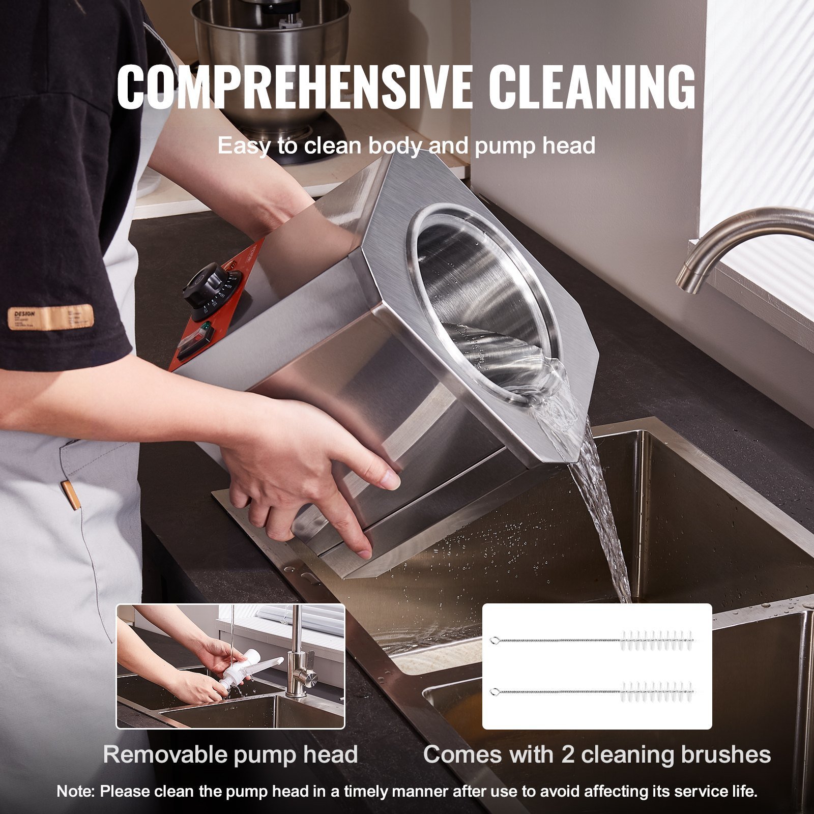 4.Effortless Cleaning: The cheese sauce dispenser is designed with separate food and water basins, and a detachable pump head for cleaning ease. This design not only facilitates simple water refilling and draining but also ensures comprehensive cleaning without the worry of sauce residues clogging the pump.