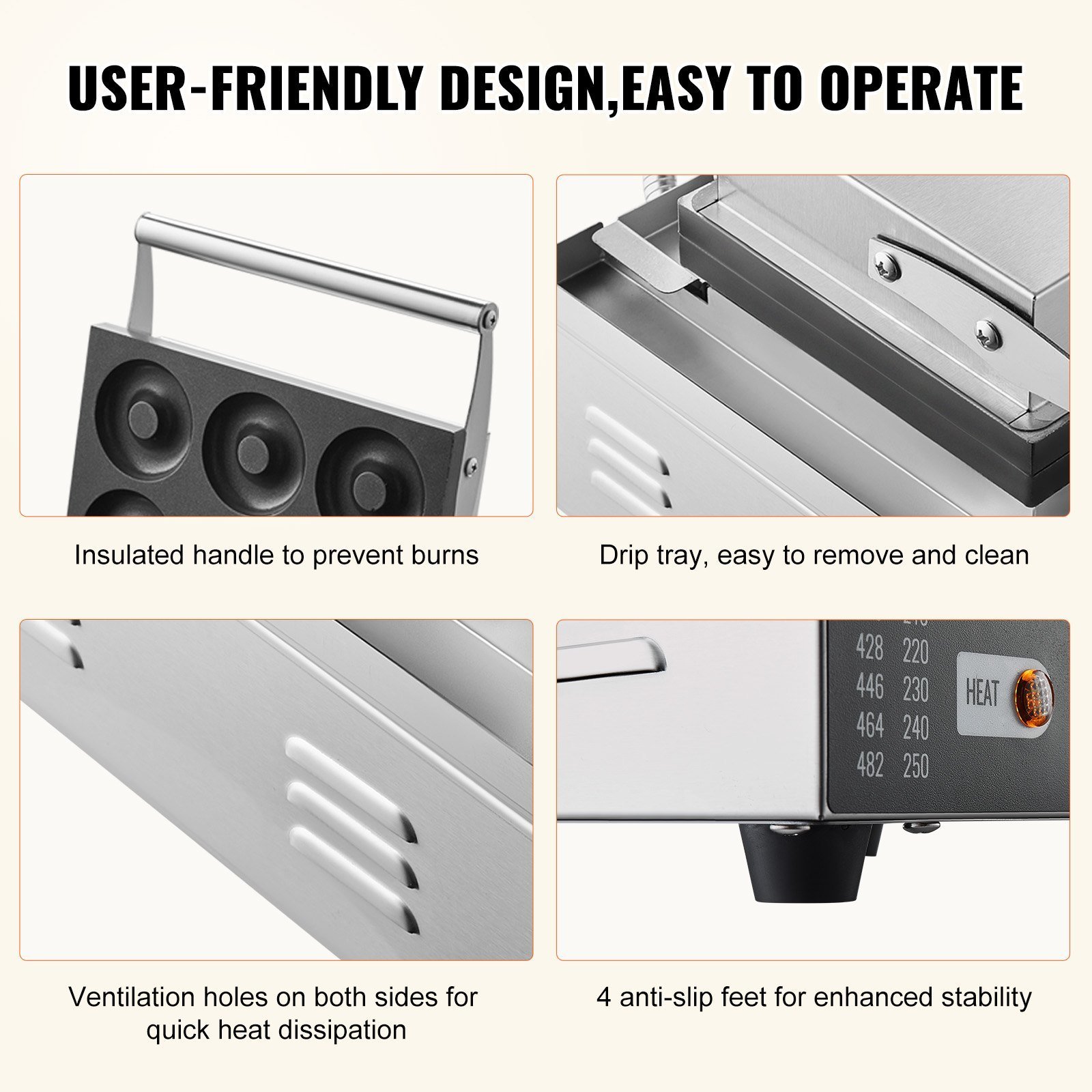 The electric doughnut machine includes a heat-resistant stainless steel handle to prevent burns. The drip tray is easily removable for convenient cleaning. Side vents enhance cooling for efficient machine operation. Anti-slip feet ensure the donut maker's stability and accessibility.