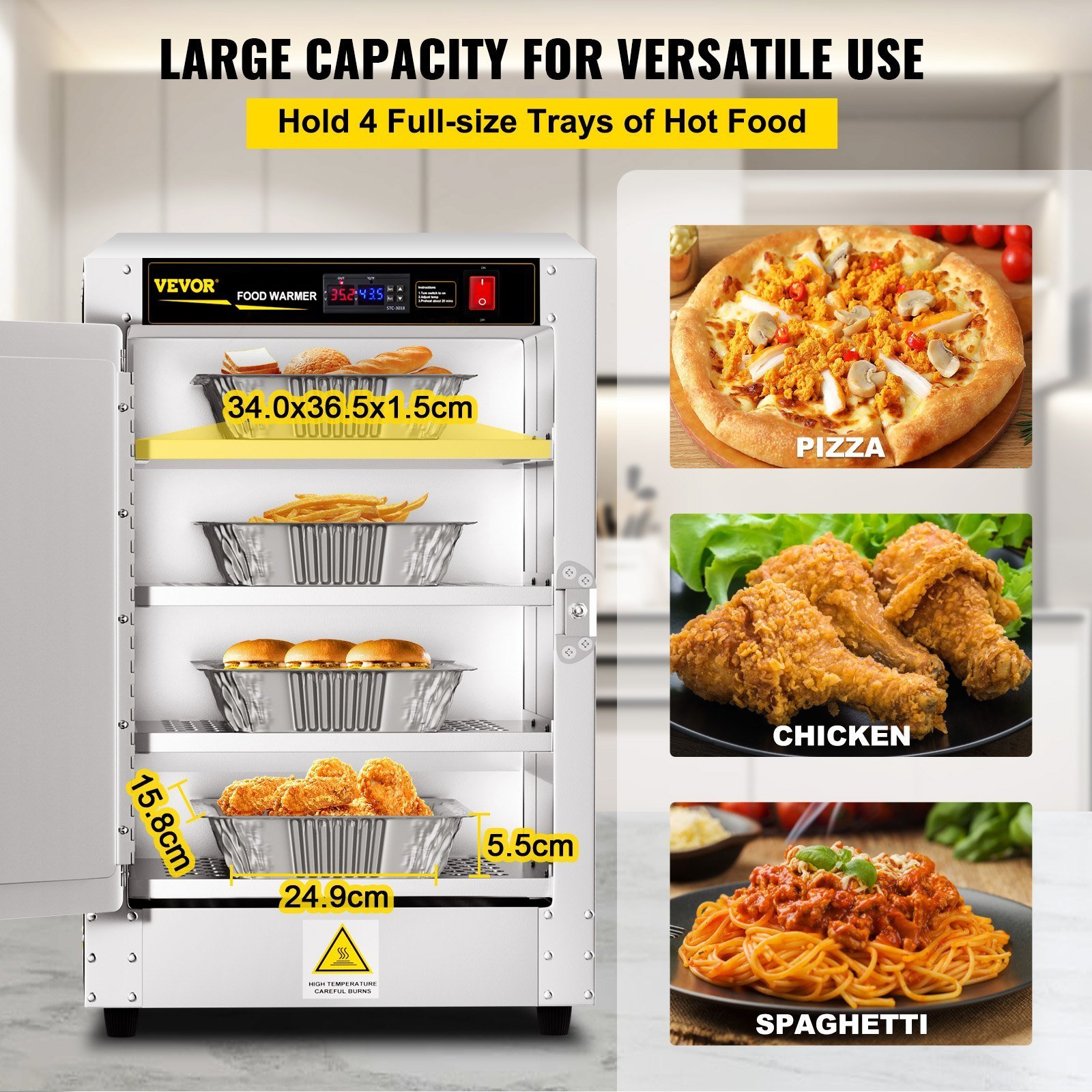 1.Four-layer Catering Shelf: This hot box food warmer can hold four 13.4" x 14.4" x 0.6" food trays or four 9.8" x 6.2" x 2.2" food boxes in different intervals, which is ideal for storing pizza, chicken, hamburgers, spaghetti, etc.