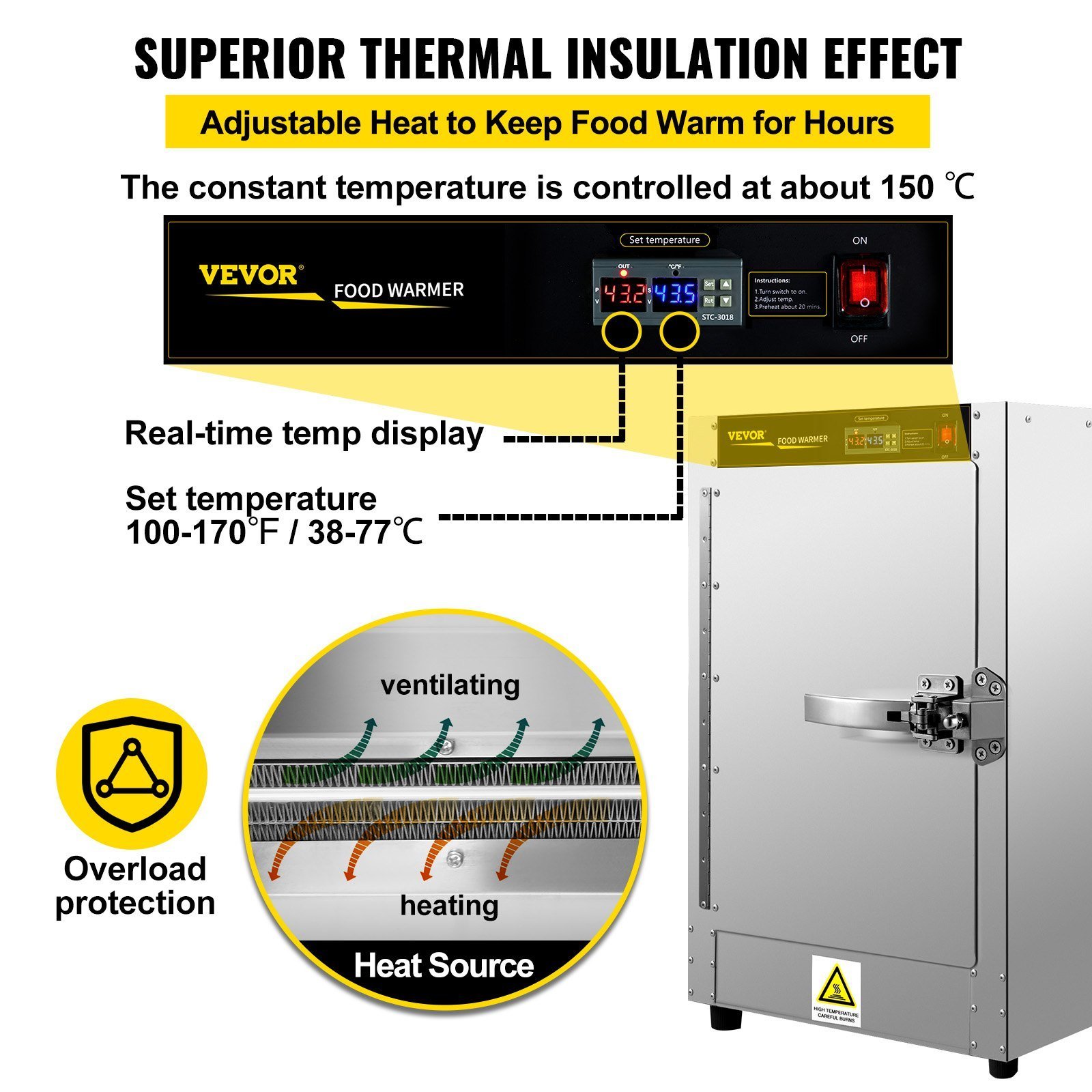 Temperature control for adjusting heating temperature from 100 to 170°F; thermostatic mode keeps the food at 150°F constantly and the internal PTC heat source can avoid over-heating, perfect for commercial catering use.