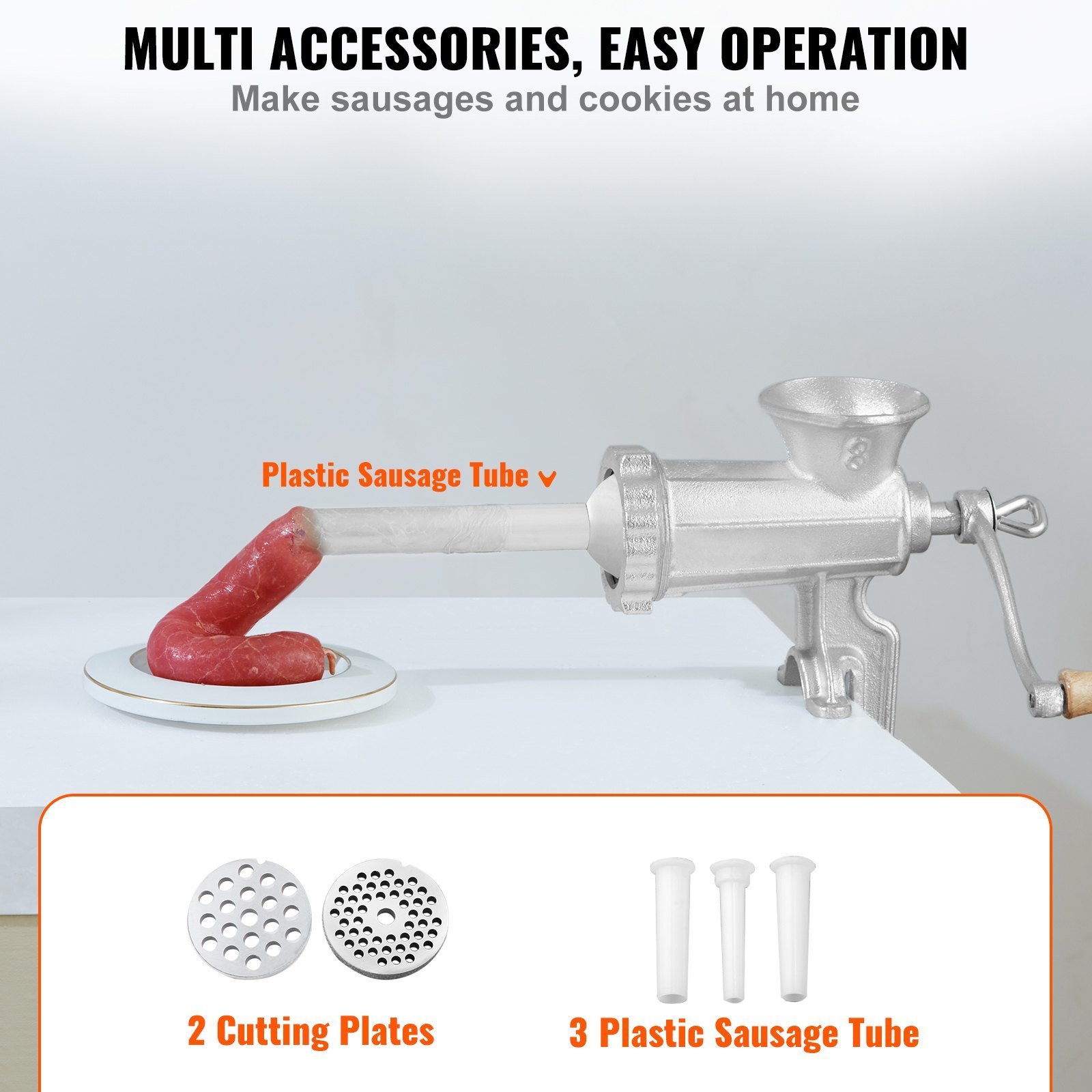 1.One Meat Grinder, Endless Uses: VEVOR multifunctional manual meat grinder allows for easy vegetables and meat grinding to make meatballs, sausages, and more. It also comes with 5mm and 8mm cutting plates, 1 cutting blade, 3 plastic sausage tubes, and meat pusher, catering to the diverse needs of different culinary creations.