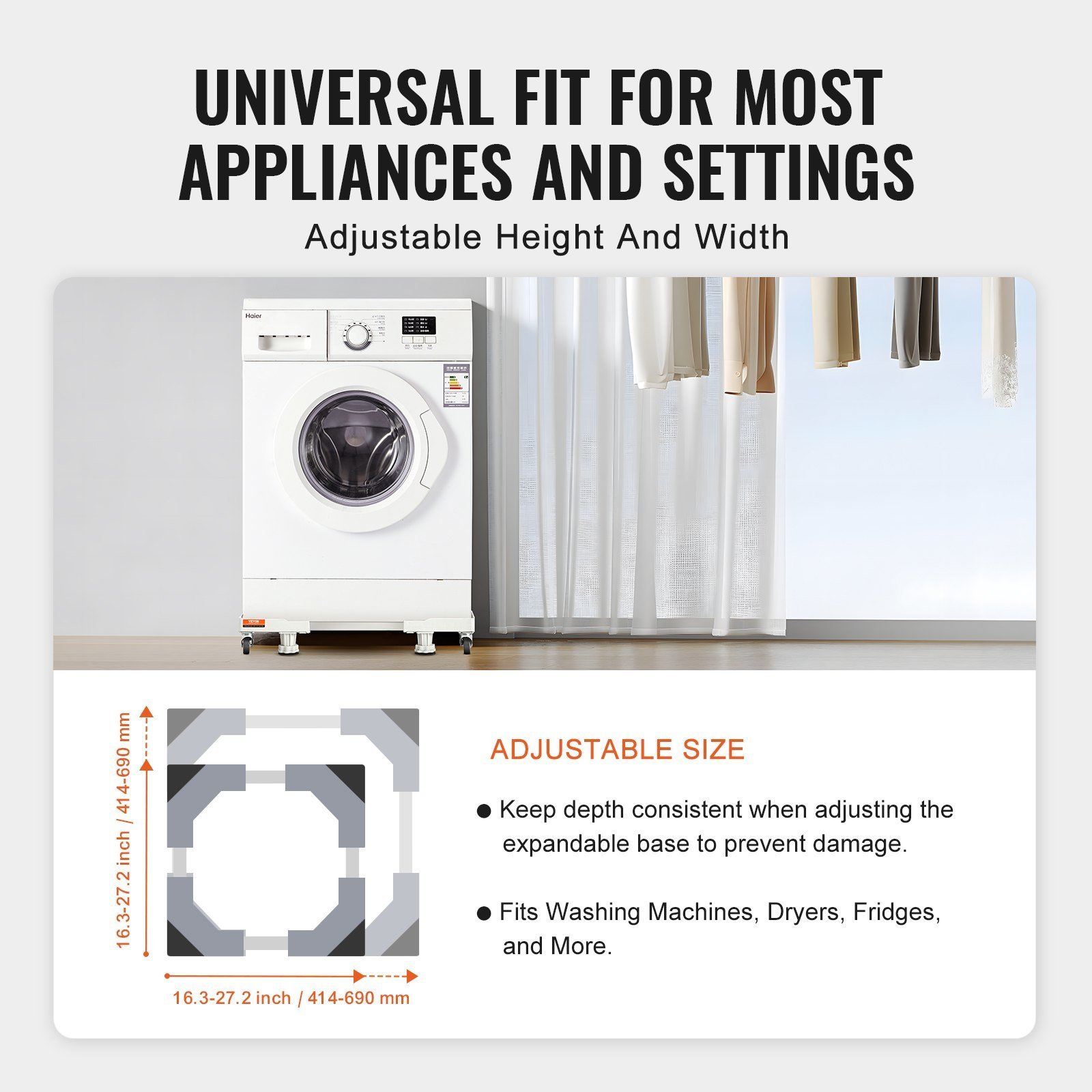 The extendable washing machine pedestal, featuring reinforced stainless steel pipes, supports a minimum load of 800 pounds (362.9kg) at its smallest size and a maximum load of 330 pounds (149.7kg). Ideal for elevating various household appliances.