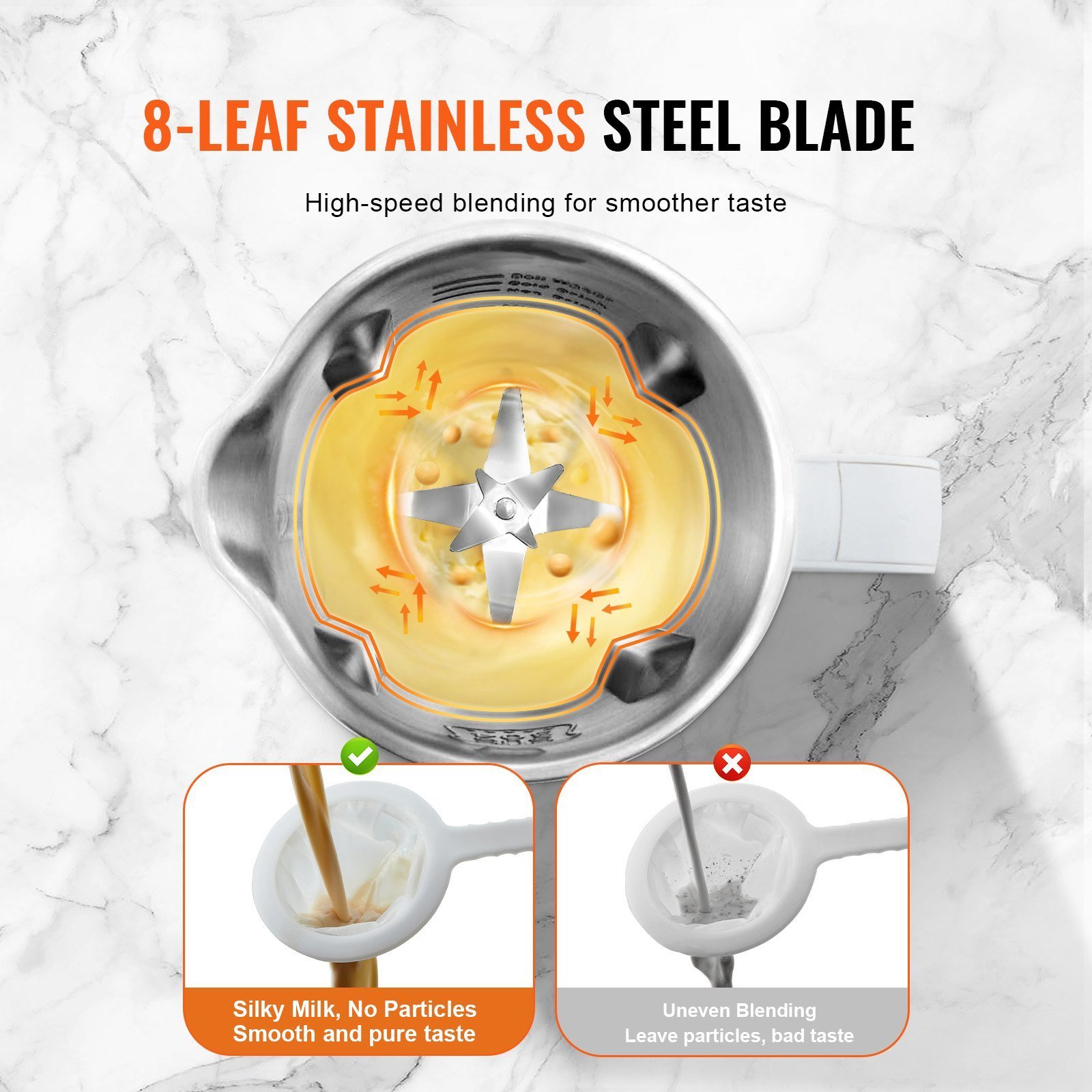 2.Speedy Blending, Smoother Taste: Say goodbye to uneven blending! Our soy milk maker comes with 8-leaf stainless steel blades, sturdy and sharp. Its multi-blade structure ensures rapid and thorough blending, leaving you with silky-smooth, residue-free beverages.
