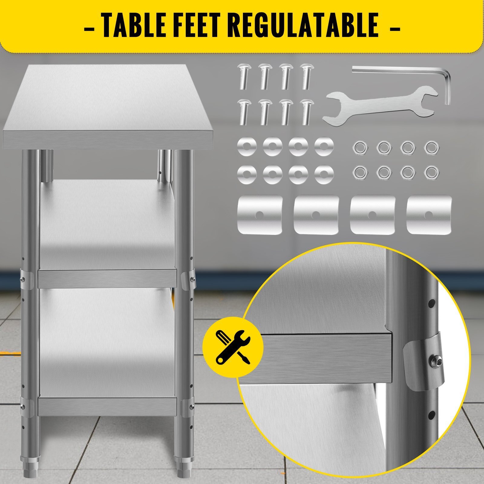 This superior commercial work table is constructed with durable stainless steel so that it won't deform easily. With a large capacity and two storage shelves, it can accommodate more items and keep them organized. It also features four adjustable feet. You can easily change the height by rotating the feet—perfect using the kitchen, restaurant, school, and other domestic or commercial applications.
