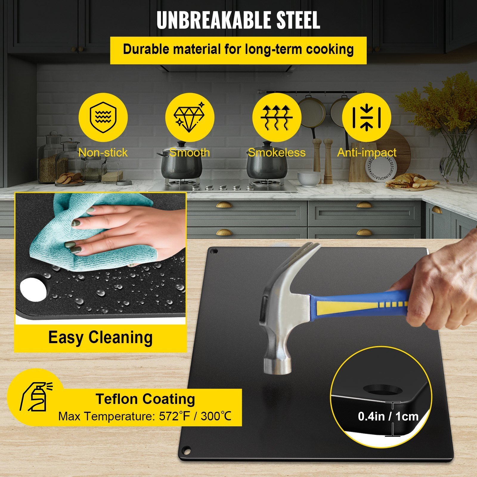 With high-quality steel and Teflon coating, our smooth and unbreakable baking steel for oven has high durability and great thermostability. In addition, unlike other cordierite pizza stones, the steel pizza stone can ensure a more crisp taste.