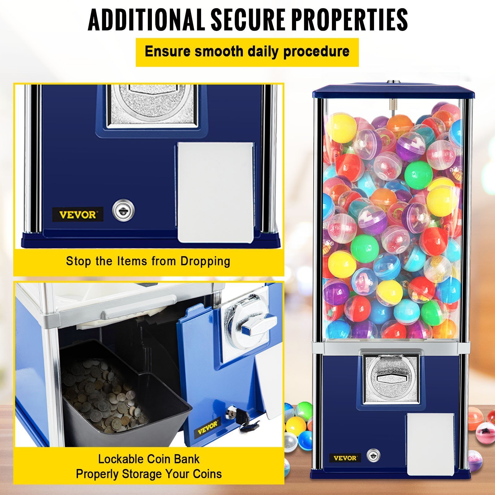 4.Unique Secure Design: The internal coin bank of our candy vending machine is set with a lock that can only be opened by our matching keys, which means that you can store the coins properly. Besides, the baffle over the outlet can ensure the items’ not falling out of the outlet.